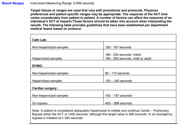 If you use the Medtronic HR-ACT cartridges, what is your reportable range? I have one department who was told sometime before I started not to report above 600 seconds and I found a very confusing paragraph at the bottom of page 6 of the cartridge IFU...
