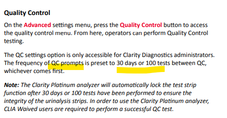 The QC lockout feature is adjustable. I had the same question regarding frequency of QC since our practices perform each time a new bottle is opened and every 30 days (if same bottle of strips is being used to ensure proper storage).