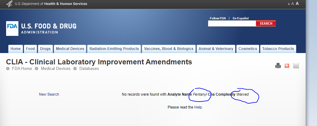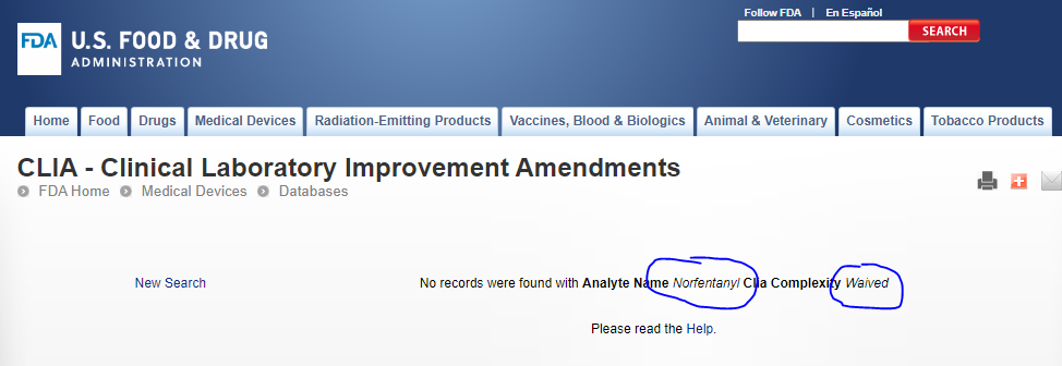 When I'm looking for a test for a particular complexity, I use the FDA Medical Device Database for test complexity. Since the FDA decides which test has which complexity it is very reliable and helps to turn away some zealous sales folks who do not actually know if their own device is waived, nonwaived or approved at all. Looking at Fentanyl/Nor Fentanyl (the metabolite of Fentanyl) and waived there are not any tests.