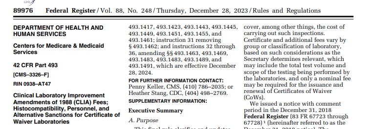 Final Rule- Clinical Laboratory Improvement Amendments of 1988 (CLIA) Fees, Histocompatibility, Personnel, and Alternative Sanctions for Certificate of Waiver Laboratories (CMS-3326-F)