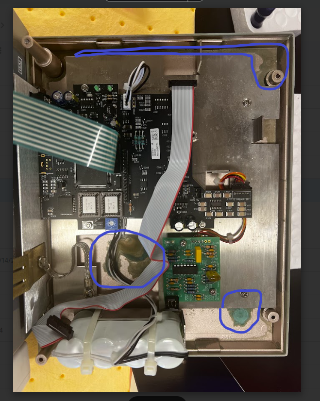 We have taken our AVOXimeters apart multiple times and never seen anything like that. It looks like someone is using a cleaning product on your instrument.