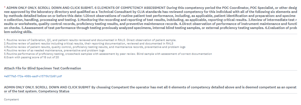 We use HealthStream for our POC competencies. I have courses for each POC testing platform built that have a policy link for review, a quiz, and a checklist. The employee must complete the first 2 portions before the checklist can be completed. The checklist is completed by either myself, or another approved Technical Consultant after the direct observation has been performed. The checklist has each of the required 6-elements of competency listed for me to mark as met and then I upload and attach a file with the blind sample records to the checklist.
