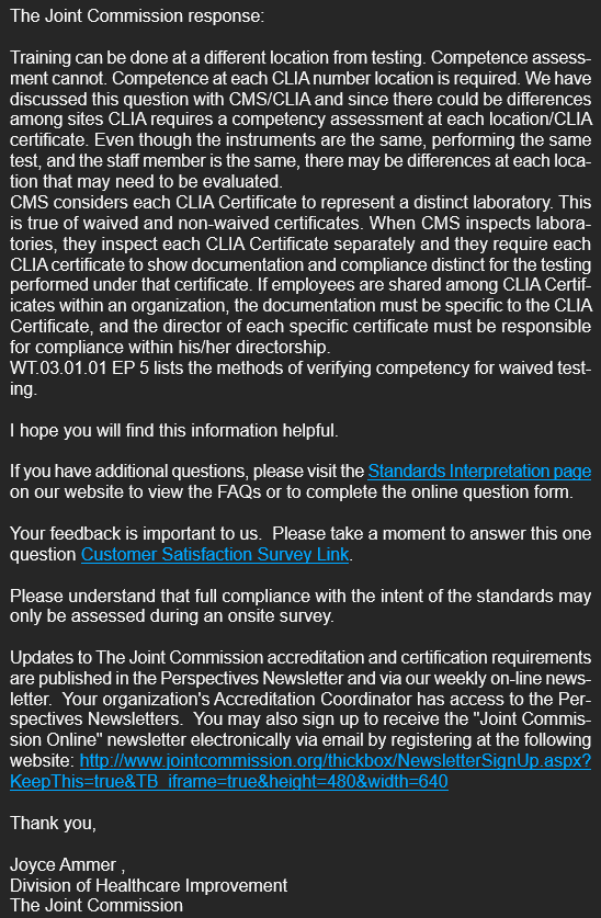 Kari: We are accredited by The Joint Commission as well. I appreciate you outlining your current process - it sounds a lot like what we are hoping to implement. I asked TJC for clarification on this topic and I am still waiting on their reply. Was it an inspector that told you training/competency didn't have to occur at each CLIA site? I'm hoping to be able to show my receipts when we overhaul our competency system.