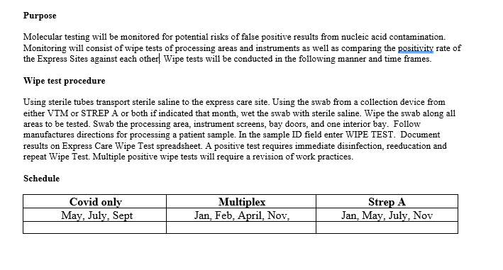 We are currently using the Cepheid to perform the Covid/flu/rsv/strep and I was wondering if anyone has a procedure or tracks a monthly swipe test to ensure the area is clean and the wells are not contanimated? If so, would you be willing to share your procedure or thoughts on this?