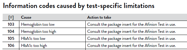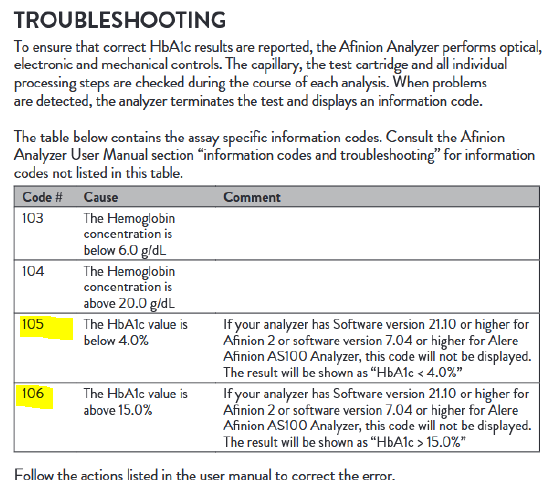 Those that use the Abbott Afinion 2 analyzer for A1C testing - are you reporting patient results as <4.0% and >15.0% ? Or are you NOT reporting those into your EMR and having the patient get a venous A1C done in a clinical laboratory instead? For a lower software version the device gives an information (error) code which makes me think that the result isn't valid. But on software versions higher than 21.10 - we have software version 21.14 - The user manual says to consult the package insert and the package insert says to consult the user manual. It doesn't say if those values are valid to be reported and treated on, or if they need to be confirmed via another method. What are other people doing with those < and > A1C results?Capture2.PNGCapture.PNG