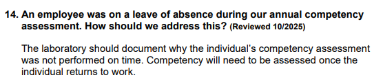 Suppose someone is trained and competencied for a non waived device at the 6 month mark and then goes on medical leave for some time and goes past the 12 month and maybe the annual - would you reset their competency period or would you competency them and call it what it would have been if it was at that point in their competency assessment period.